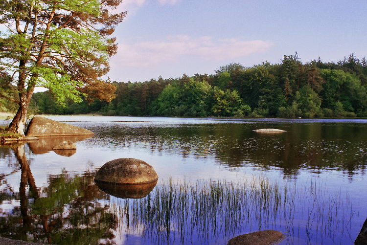 Dans ce très joli cadre de verdure, des cailloux aux formes arrondies affleurent l’eau, les roseaux se développent en nombre, en été les nénuphars fleurissent en abondance à la surface.